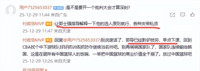 最近,名记付政浩对国家队和国手的表现作了评论,他表示,看了男篮世预赛的蹩脚表现,试问谁不深感压力呢?但篮协的紧迫感和责任感又体现在哪呢?比赛都结束了一个月了,说好的深刻总结又总结到哪了?他在与球迷的互动中更是痛斥了郭士强,“让郭士强指导解释一下他的选人原则就行,各种夹带私货”,“郭导已经黔驴技穷,早点下课,回到CBA找个中下游球队好好抓训练抓防守继续当名帅吧。别再祸祸国家队了,国家队连续输给韩国,这是在砸所有中国篮球人的饭碗,一举把中国篮球的商业价值全干崩了。放过中国篮球吧”,付政浩最后激动地对郭粉说:啥都别说了,要点脸吧,请郭士强指导早点下课!
