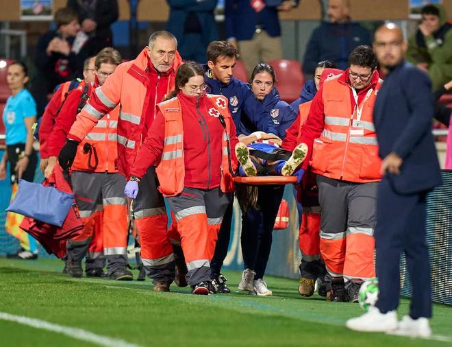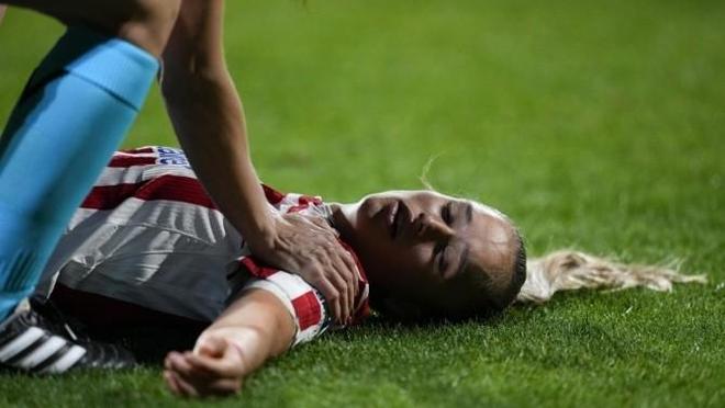 惊险一幕,马竞女足球员梅迪纳头部被膝盖撞到后失去意识